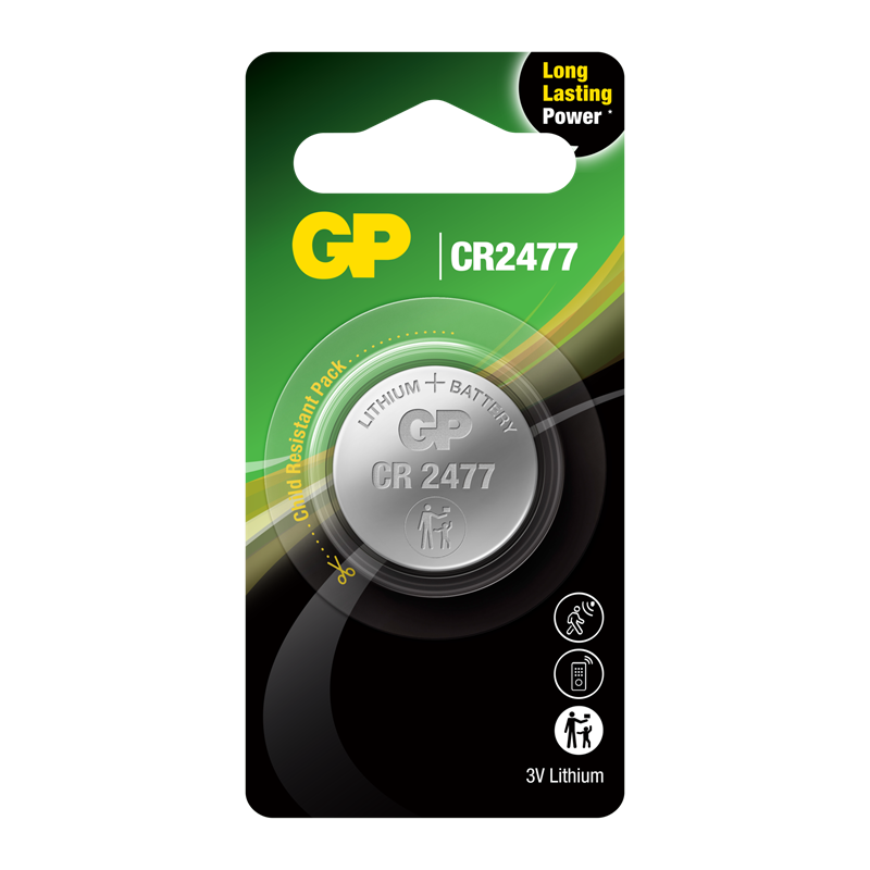 GP Lithium CR2477 knappcellebatteriet har høy energitetthet og er designet for å gi langvarig, overlegen strøm til dine høyteknologiske enheter, inkludert smarte hjemmeenheter, bevegelsessensorer, smarte fjernkontroller, smarte klokker, bilnøkler og garasjeportåpnere.