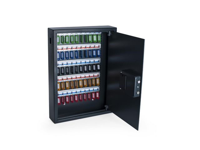 Antrasittgrått skap av metall til oppbevaring av nøkler. Sikker oppbevaring av nøkler i resepsjon, vaktstue eller kontor.